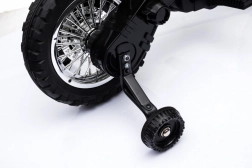 Otroški električni motor v motokros slogu je idealen za prve vožnje na dveh kolesih. Preprosto upravljanje zahvaljujoč plinu v ročaju in načinu vožnje naprej pomaga graditi samozavest, medtem ko snemljiva pomožna koleščka zagotavljajo stabilnost na vsaki podlagi. Sprednje LED luči ter panel z zvoki in melodijami poskrbijo za dodatno mero zabave in realizma.