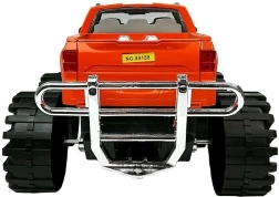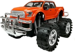 Oranžni truck z izrazitim vzmetenjem, kromirano masko in robustno konstrukcijo za igro doma in na prostem.