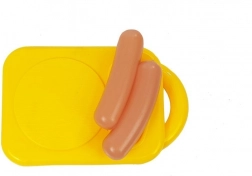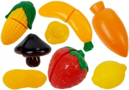 kuhinjski štedilnik, kuhinjska tehtnica, deska, 4 skodelice s krožnički, čajnik, solnica, kozica, lonec, ponev z dvema ročajema, 3 pokrovke, krožniček, košarica, lonček, jedilni pribor (2 noža, 2 vilici, 1 žlica), 2 lopatki, živila (hrenovke, jajce, banana z ježkom, koruza z ježkom, jagoda z ježkom, goba z ježkom, korenje, limona, orešek), stekleničke (kečap, olje, 2 omaki)