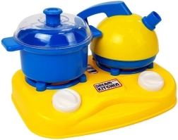 • Bogata vsebina: štedilnik, čajnik, lonci s pokrovčki, ponev, skodelice s krožnički, jedilni pribor, deska, kuhinjski pripomočki, makete živil in stekleničk z začimbami.