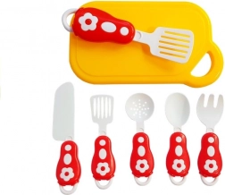 Set vključuje tudi plastične pribore, nož in majhno desko za rezanje, kar poveča kreativnost pri igri kuharjev. Primeren je za otroke od 3. leta starosti in ustreza standardu EN71.