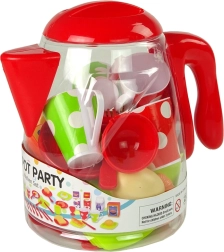 Pakirano v plastičnem ovoju v obliki čajnika z rdečim pokrovom in ročajem. Vsebuje pisane skodelice in žličke.