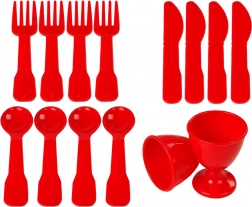 Set vsebuje vilice, nože, žličke in stojalo za jajce. Lahko in varno za igro.