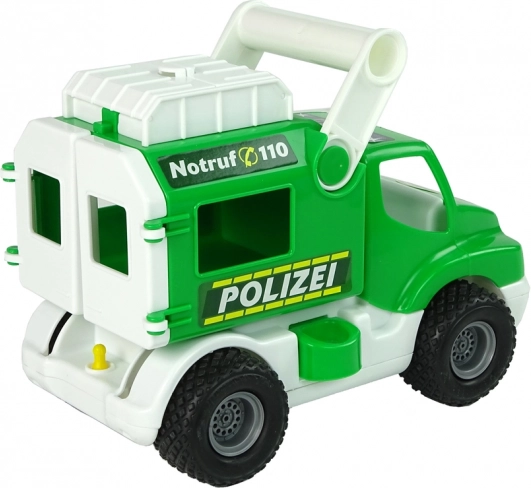 Zeleni policijski avto ConsTruck znamke Polesie je vzdržljiva igrača za otroke od 1. leta. Ponuja gumijasta kolesa z dezenom za boljši oprijem, odpirajoča se zadnja vrata in zgornji predal za shranjevanje zakladov in figuric. Stranska varovalka prikolice in nagibna kesica zagotavljata dolge ure zabave ter spodbujata razvoj fine motorike in logičnega mišljenja. Izdelano iz varnih, atestiranih materialov, z certifikatom CE.