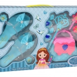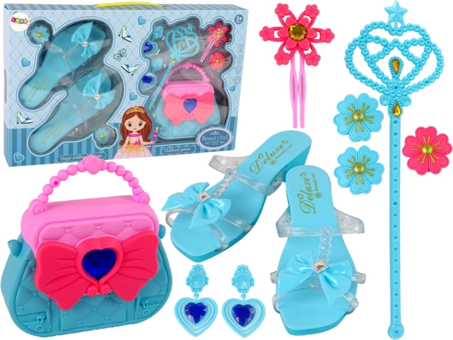 Naš zabavni lepotni set vsebuje vse, kar mala deklica potrebuje za igro princese. Del seta so čudoviti modri sandali s prozornimi plastičnimi paščki in dekorativnimi mašnimi z bleščečimi kamenčki, ki zagotovo pričarajo nasmeh na vsakem otroškem obrazu.