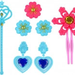 Poleg sandalov v setu najdete tudi modro čarobno paličico z okraski v obliki srca, idealno za pravljične igre. Na voljo so tudi sponke in uhani, ki dopolnijo vsak princeskin videz in spodbujajo otroško domišljijo. Ta paket je odlična izbira tako za pustovanje kot za vsakodnevno igro doma.