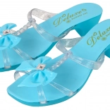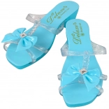 Čudoviti modri sandali, ki polepšajo vsako priložnost, so izdelani iz plastike s prozornimi paščki in mašno, okrašeno s kamenčki.