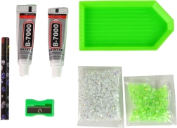 Vsebuje vse potrebne elemente, vključno z dvema paketoma kristalov, lepilom, posodico za kristale in voskano palčko.