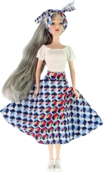 Odkrijte čar punčke EMILY z dolgimi sivimi lasmi, svetlo modrimi očmi in usklajenim naglavnim trakom. Nosí bel top in razširjeno krilo z geometrijskim vzorcem, ki ga dopolnjujejo bele čevlje. Del seta sta prisrčen mucek in bela gugalnica – idealno za domiselne prizore in skrb za ljubljenčka.