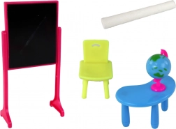 Odkrijte odličen komplet igrač, ki vključuje učiteljico in učenko, oblečene v elegantna in stilska oblačila. Set dopolnjuje tabla s kredo, mizica in stolček, ki so idealni za ustvarjanje šolskega okolja. Globus omogoča odlične možnosti za igro učenja in spoznavanja sveta.