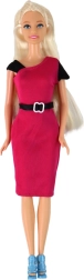 Lutka učiteljice z dolgimi blond lasmi in roza elegantno obleko s črnim pasom.