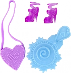 Set vključuje rožnate petke, srčno torbico in okrogel moder dodatek – vse se ujema z outfitem punčke in razširja možnosti igre.