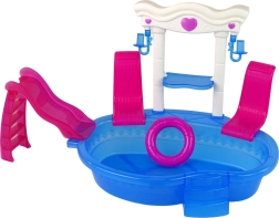 Del seta je tudi tobogan, ki ga otroci obožujejo! Dodatki kot so vijolične pijače in roza sandali poudarijo poletno vzdušje. Poleg tega je tu plavalni obroč, ki dodaja dodatne možnosti pri igri.
