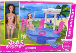 Predstavljamo lutko z interaktivnim igralnim setom, ki vključuje vse potrebno za pustolovščine pri bazenu. Čudovit moder bazen velikosti 26 cm x 34 cm x 23,5 cm je idealen za napolniti z vodo in ustvariti prostor za vodne pravljice. Na voljo sta tudi dva roza ležalnika, kjer bosta lutka in njen pasji prijatelj našla udobje.