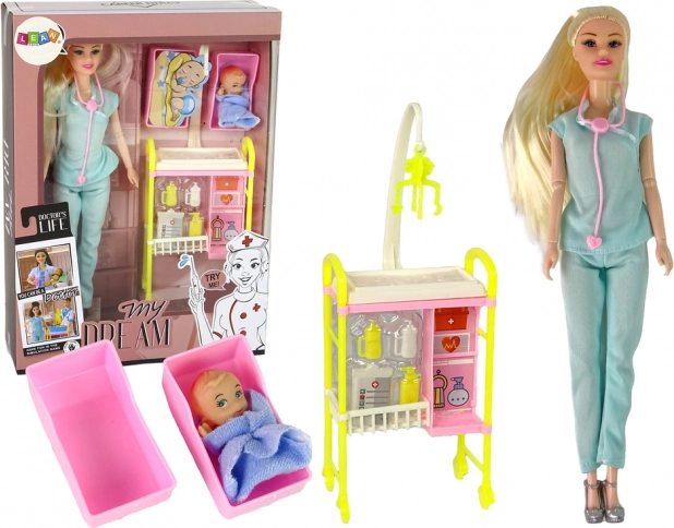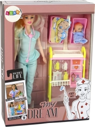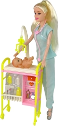 Pripravite se na fascinanten svet medicine s to izjemno punčko. Oblečena v tipičen zdravniški outfit z dolgimi svetlimi lasmi prinaša avtentično vzdušje v vsako igro. Rožnat stetoskop doda verodostojnost, medtem ko priloženi dodatki, kot sta dojenček in medicinski voziček, spodbujajo ustvarjalno igro.