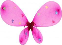 Velika rožnata krila z barvitimi motivi metuljev in svetlečim obodom. Lahka konstrukcija in pritrjevanje z elastikami za udobno nošenje.