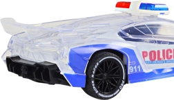 Zabaven policijski športni avtomobil na daljinsko upravljanje v merilu 1:16 s prosojno karoserijo in barvnimi lučmi. Zahvaljujoč intuitivnemu upravljalniku omogoča natančne manevre in poln razpon gibanja. Izpolnjuje standarde CE in EN71, primerno od 3 let; napajanje 4× AA za avto in 2× AA za upravljalnik (nista priložena).