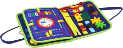 Vključuje različne manipulativen elemente kot so zadrge, gumbi in vrvice za razvoj fine motorike.