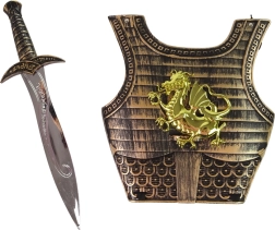 Celoten komplet samurajskega kostuma za otroke vsebuje zlati oklep z motivom zmaja, ki ga enostavno prilagodite z elastičnimi gumijastimi trakovi. Kostum je opremljen s udobnim mečem z različnimi vzorci na ročaju in lokom za natančno streljanje na daljavo.