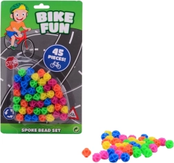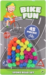 Barvane okrasne perlice za kolo. Material: plast. Paket vsebuje 45 perlic. Po namestitvi se premikajo gor in dol glede na gibanje kolesa. Izdelek ni igrača