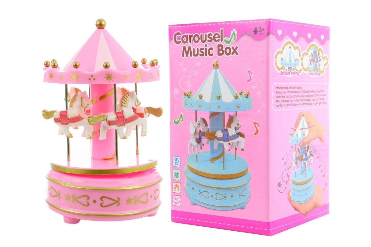 Igralni vrtiljak. Ko vrtiljak zavrtite, zaigra melodija in se vrti. Velikost približno 11 × 11 × 18 cm. Zapakirano v škatli. Ne deluje na baterije, deluje ročno. Starost 3+