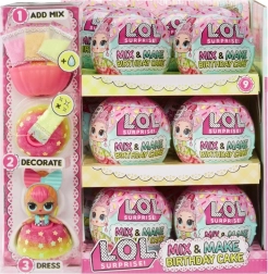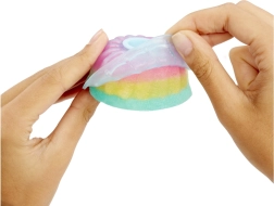 Spremeni igro v sladko praznovanje! Otroci zmešajo barvne mešanice z vodo, napolnijo kalup in v hipu ustvarijo obleko v obliki rojstnodnevne torte. Nato jo samo odstranijo iz kalupa, okrasijo z bleščicami, oblečejo punčko in začne se zgodba, polna domišljije.