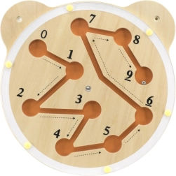 Ta stenska izobraževalna tabla Viga v obliki prikupne medvedje glave združuje zabavo in učenje. Z vrtenjem plošče usmerjate jekleno kroglico po utorih tako, da postopoma doseže vsako številko od 0 do 9. Otroci naravno urijo štetje, potrpežljivost in reševanje problemov.