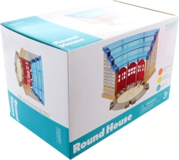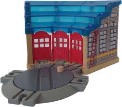 Veliko depo, ki nudi dom in zaledje kar trem lokomotivam ali vagončkom. Toplina in mir v njem jim dajeta moč za dolge poti po železnicah po dolgem in počez. Dvonadstropna streha vam omogoča popoln dostop do vseh parkiranih lokomotiv, ki jih je treba popraviti ali zgolj očistiti in pripraviti na naslednjo vožnjo. To depo ima lastno obračalno ploščo, ki lokomotivam ponuja veliko udobja pri najedanju na tire in obračanju vagončkov ter lokomotiv. Vsebina: depo in obračalna plošča. Dimenzije depa z obračalno ploščo: 34 × 34 cm, višina 18 cm, premer obračalne plošče 18 cm. Dimenzije pakiranja: 31 × 21 × 20 cm. Maksimove lesene vlakovne proge in dodatki so združljivi z vsemi drugimi lesenimi vlakovnimi progami na trgu. Za otroke od 3 let.
