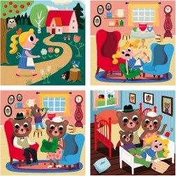 Štiri samostojne sestavljanke s po 9 koščki korak za korakom pripovedujejo pravljico o Zlatolaski ter spodbujajo otroško domišljijo in pripovedovanje.