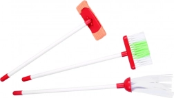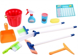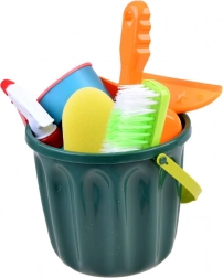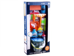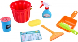 Popolna oprema z vedrom, mopom, ročno metlico, smetišnico, krtačo, gobico in drugimi dodatki za realistično igro pospravljanja.