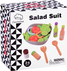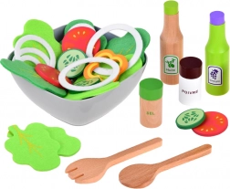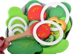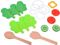 Tekstilni lističi zelenjave, lesene začimbnice in servirna žlica omogočijo otrokom pripraviti »pravo« solato ter razvijati domišljijo pri kuhinjski igri.