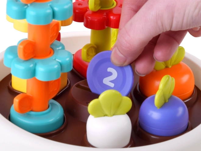 Igrača podpira fine motorične sposobnosti otroka z interaktivnimi elementi, kot so zložljive rože in barvni žetoni.