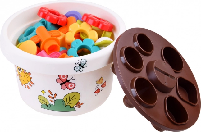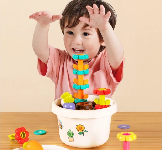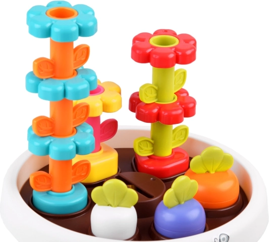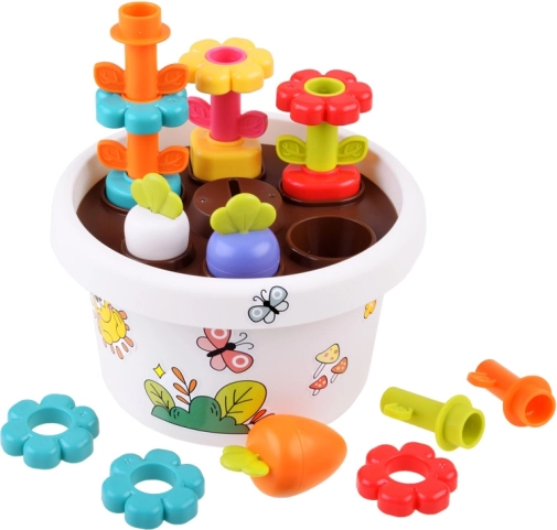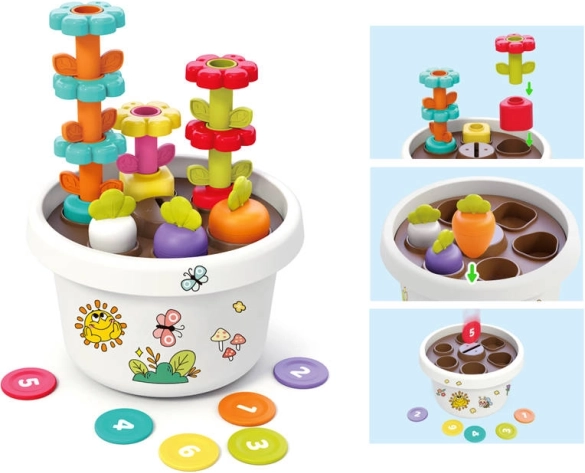 Vsak del igrače ponuja različne možnosti, kako se lahko otroci naučijo osnovnih barv in oblik. Vse dele je mogoče enostavno pospraviti v cvetlični lonček, kar prihrani prostor in ohranja red.