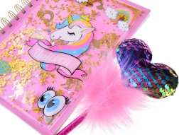 Ta čarobni dnevnik z motivom enoroga ponuja idealen prostor za zapisovanje vaših misli, skrivnosti in idej. S sijajnim ovitkom, posutim s svetlečimi delci, dodaja dnevniku edinstven in privlačen videz. Privlačen set prav tako vključuje roza pisalo s puhastim pomponom in svetlečim srcem, skupaj z barvnimi nalepkami za kreativno okrasitev.