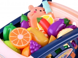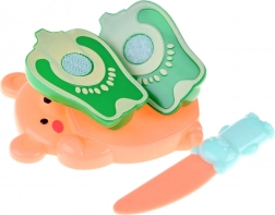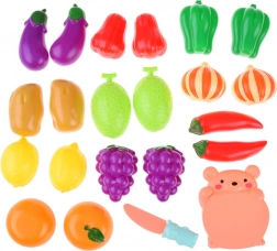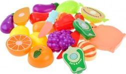 Zelenjava/sadje sta prav tako iz plastike v privlačnih barvah. Med seboj se spajata s pomočjo ježka, zato se lahko otrok igra rezanje.