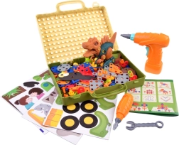 Ta zabavna sestavljanka otrokom omogoča, da s pomočjo vijakov, matic in orodja sestavljajo barvite oblike in dele dinozavrov. Otroški vrtalnik na 2× AA (baterije niso priložene) in izvijač spodbujata spretnost, koordinacijo oko–roka ter učita osnov tehničnega razmišljanja v duhu STEAM.