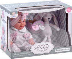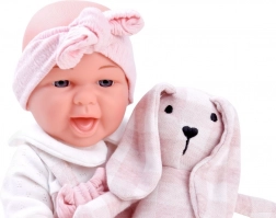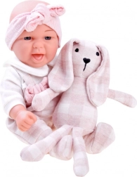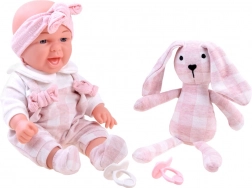 Ta ljubka punčka – dojenček je oblečena v belo‑rožnat komplet z mehkim naglavnim trakom, srajčko, povezano s karirastimi hlačkami, in belimi nogavičkami. V kompletu najdete tudi mehkega plišastega zajčka z izvezenimi očkami in nosek ter dve dudi (belo in rožnato). Vse je usklajeno v nežni rožnato‑beli paleti, ki deluje milo in čisto.