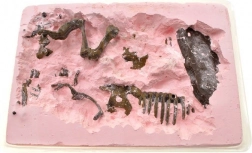 Mavčni izkopavalni blok, čopič, dleto, kladivce s strgalom, deli okostja, podstavek