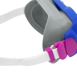 Maska z mehkim silikonskim tesnilom in nastavljivim trakom se prilagodi otroškemu obrazu in trdno drži pri vsakem zamahu.