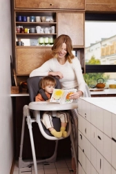 Stolček ima dvostopenjsko nastavitev pladnja, pomembno pa je, da se zunanji pladenj lahko pomiva v pomivalnem stroju.