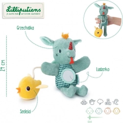 Prisrčna lutka za roko iz kolekcije zmaj Joe znamke Lilliputiens prebuja domišljijo in čute dojenčkov od 6 mesecev naprej. Ima odprtine za prste za enostavno oživljanje, v glavi skrito ropotuljico, na trebuščku mehko ogledalce in na vrvici šušteče piščančko. Dovršena izdelava, varni materiali in nežne teksture spodbujajo fino motoriko, koordinacijo oko–roka ter zaznavanje zvoka, vida in dotika.