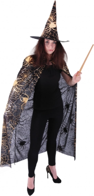 Stajliš čarovniški plašč in klobuk z bleščečim zlatim potiskom pajčevin spremenita vsak kostumski večer v magičen dogodek. Zaradi univerzalnega kroja in lahkega materiala sta udobna za nošenje in ju je mogoče preprosto kombinirati z drugimi dodatki. Idealna izbira za noč čarovnic, pustni ples, cosplay in tematsko fotografiranje.