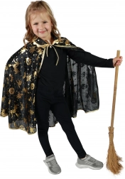 Črn otroški čarovniški plašč z zlatim potiskom zvezd, lun in drugih motivov v trenutku spremeni vsakega otroka v malega čarovnika. Je lahek, prijeten za nošenje in se zaradi zavezovanja pri vratu zlahka obleče.