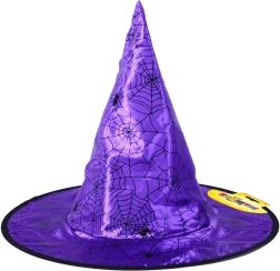 Stilski otroški čarovniški klobuk v vijolični barvi z motivom pajčevin in pajkov je idealen za noč čarovnic, karneval in tematske zabave. Zaradi izrazitega dizajna in lahke konstrukcije bo nepogrešljiv dodatek kostumu in bo vašemu otroku pomagal zasijati na vsakem dogodku.
