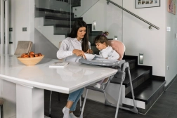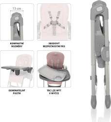 Kompakten otroški jedilni stolček z lahko, a stabilno konstrukcijo ponuja hitro zlaganje na širino le 13 cm, 6 višin, 3 položaje naslonjala za hrbet in nastavljiv podnožnik. Odstranljiv pladenj s posodico, primerno za pomivalni stroj, pralen prevlek in 5-točkovni varnostni pas zagotavljajo udobje in varnost pri vsakem hranjenju.
