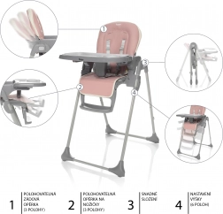 Za največje udobje otroka ponuja 3-stopenjsko naslonjalo za hrbet, 6 višinskih nastavitev in nastavljiv podnožnik. Odstranljiv pladenj z vloženim pladnjem lahko udobno pomivate v pomivalnem stroju. Pralen prevlek je dovolj obrisati z vlažno krpo, 5-točkovni pas pa otroka zanesljivo drži na mestu.