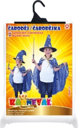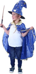 Popoln komplet za vse male čarovnice ali čarovnike za zabave ali karneval! Vsebuje moder čarovniški plašč z zlatim robom in zvezdami ter ujemajoč klobuk.