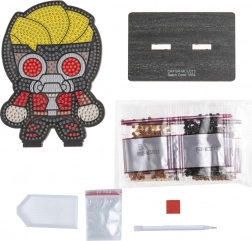 Set Kristalna Umetnost - Star-Lord vsebuje vse potrebno za ustvarjanje fascinantnega bleščečega portreta. Ustvarjalni procesi vključujejo predtiskano šablono z lepilno plastjo, barvne kristale in orodja za njihovo nanašanje.