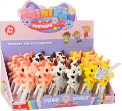 .Odkrijte naš prikupen mini vetrni mlinček v obliki krave, ki vas bo v toplih dneh razveseljeval in prijetno hladil! Ta edinstvena igračka deluje ročno s stiskom bele ročice, zato je uporaba izjemno preprosta in za otroke povsem varna. Vetrni mlinček je na voljo v treh čudovitih barvah: rumeni, beli in rožnati, zato lahko izberete svojo najljubšo.