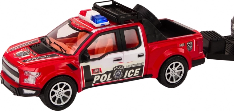 Igrača policijski pickup s prikolico je vznemirljiv komplet za male ljubitelje motorizma in iger policistov. Komplet sestavljata rdeč policijski pickup in prikolica s črnim terenskim policijskim avtomobilom na njej.